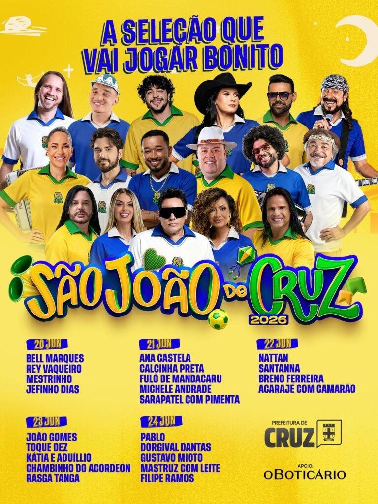 Com uma grade que reúne grandes nomes da música nacional, o São João de Cruz reafirma sua posição como referência no período junino, oferecendo uma programação diversificada, que contempla diferentes estilos e públicos. No circuito Luiz Gonzaga, principal palco da festa, localizado na Avenida Getúlio Vargas, no bairro Coplan, a programação reúne artistas como Ana Castela, Bell Marques, Nattan, João Gomes, Mestrinho, Rey Vaqueiro, Calcinha Preta, Pablo, Toque Dez, Dorgival Dantas, Gustavo Mioto e Mastruz com Leite.